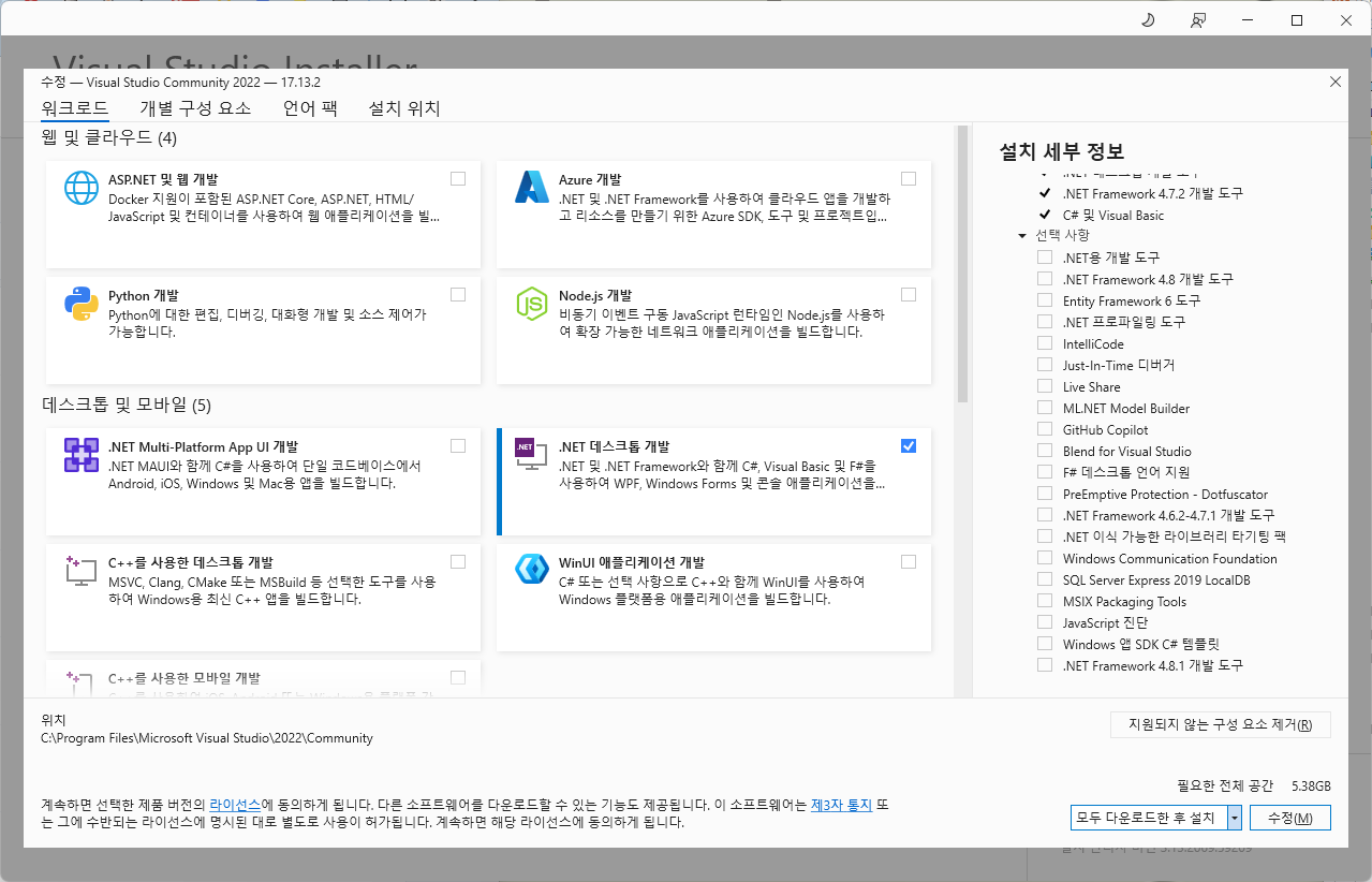 /> VisualStudioSetup.exe --layout .\VS2022offline --add Microsoft.VisualStudio.Workload.ManagedDesktop --add Microsoft.VisualStudio.Workload.NetWeb --lang ko-KR VisualStudioSetup_C#_Download.bat0.00MB