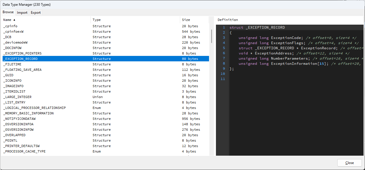 Data Type을 볼 수 있습니다. 구조체 등의 정보를 취득할 수 있겠습니다.