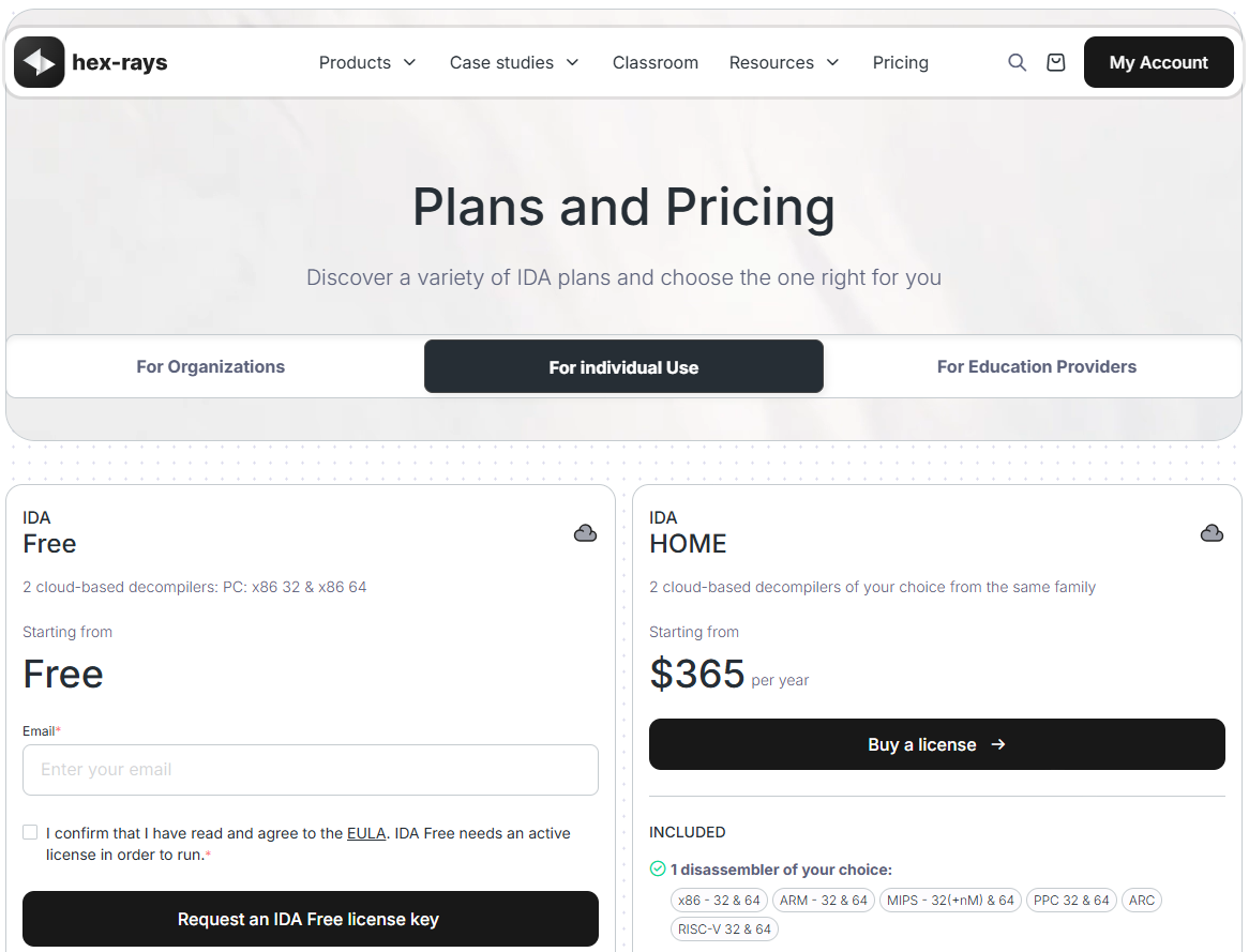 - https://hex-rays.com/ 의 유료 프로그램인데, x86|x64에 한하여 무료 licence key를 제공합니다.