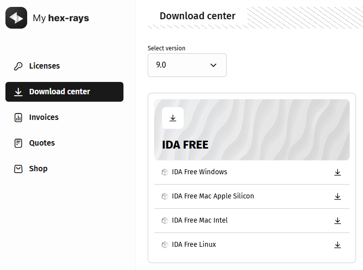 - 이메일로 전달된 코드를 이용하여 로그인 하면 Download center에서 IDA Free Windows를 다운로드 받을 수 있습니다. 다운받아 설치하면 라이선스가 없다고 나옵니다.